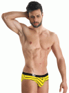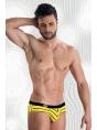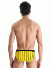 La collezione è molto ricca e carica di dettagli, con una modellistica completamente rinnovata adottata su tutti i modelli della collezione, improntata ad evidenziare i genitali maschili, grazie allo studio e alla realizzazione di una nuova patta, che permette di contenere interamente l’organo genitale maschile, grazie ad una lavorazione con un supporto elastico cucito che garantisce maggior compattezza e vestibilità che a colpo d’occhio fanno apparire il tutto più voluminoso, creando un effetto push-up senza alcuna imbottitura. il tessuto utilizzato per lo slip è una Microfibra tinta in filo di colore giallo con delle righe verticali nere, proprio grazie alla sua tintura in filo garantisce la resistenza dei colori. Un colore molto particolare adatto ad ogni occasione anche con una sfumatura sportiva, visto la sua traspirabilità. lo slip di colore giallo è bordato con un elastico nero in vita, l’etichetta eros veneziani è posta a lato Materiali: 67%PA 28%PL 5%EA