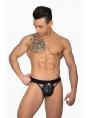 Sospensorio con patta anatomica di colore nero della linea street style; tessuto morbido ed elasticizzato, effetto second skin. sospensorio con morbidi elastici che sorreggono i glutei e fascia elastica in vita. gioco geometrico di triangoli sul davanti prodotto esclusivamente in Italia composizione: 86%poliestere 14%elastam