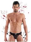 Sospensorio con un tessuto rigato semitrasparente; cucitura a vista create con un filato pregiato di colore bianco, su base nera in armonia al gioco geometrico creato dalle righe. La patta è innovativa studiata con un design anatomico, proprio per mettere in risalto le forme maschili. elastici sul retro morbidi e confortevoli Made in Italy Materiale: 80%PA - 20%EA